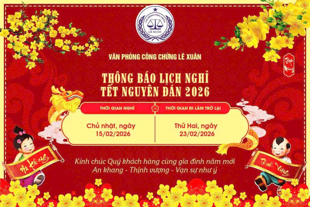 Văn phòng công chứng Lê Xuân trân trọng thông báo tới quý khách hàng lịch nghỉ Tết âm lịch 2026. Kính chúc quý khách hàng và đối tác đón Một mùa Xuân mới mạnh khỏe, an khang thịnh vượng vạn sự như ý!